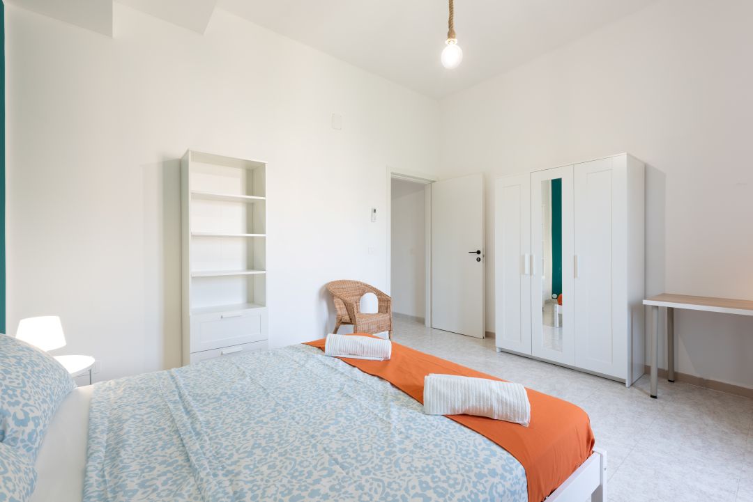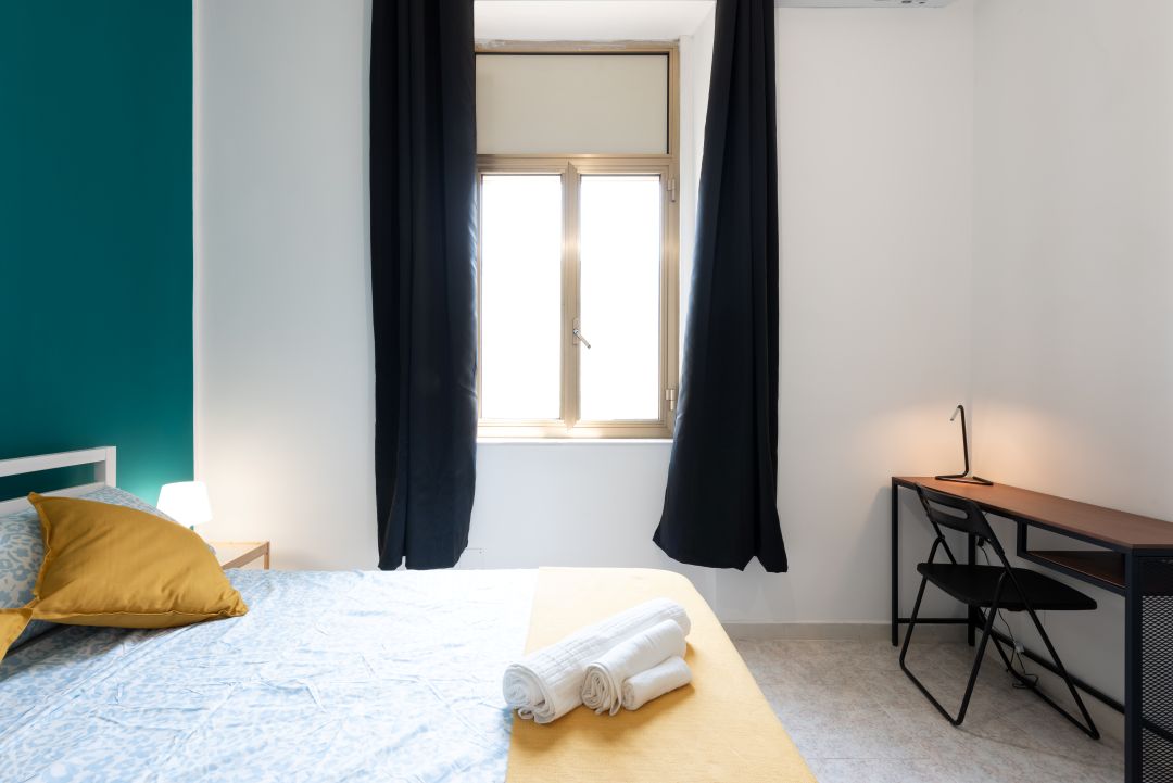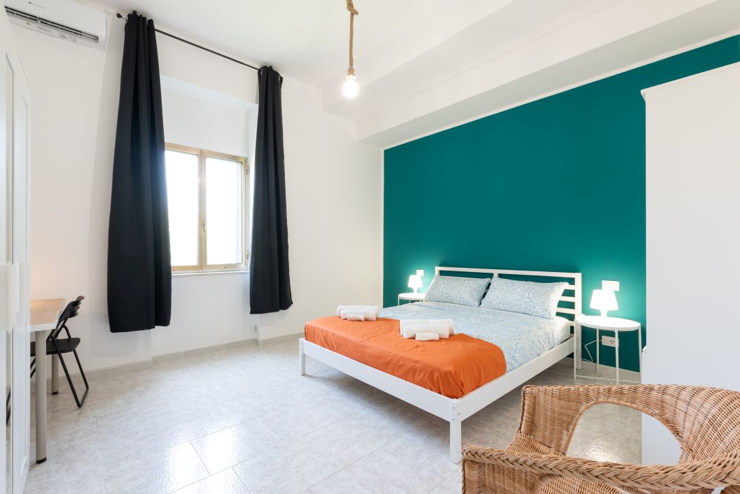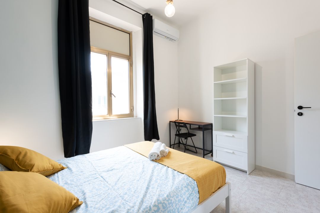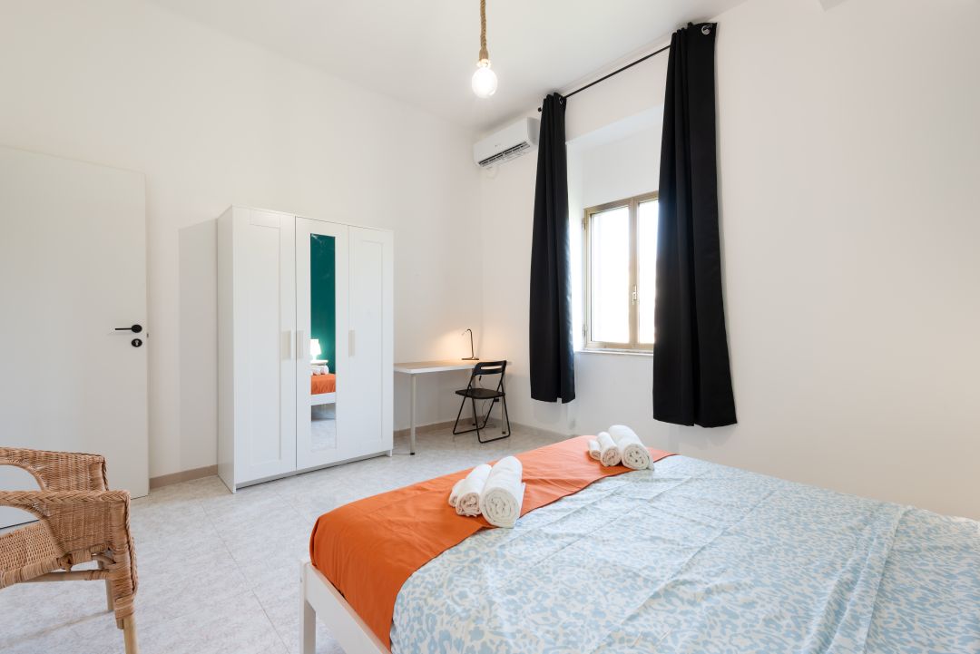 La camera è composta da letto matrimoniale, comodino, guardaroba, scrivania, sedia, aria condizionata e una finestra che rende la stanza luminosa e piacevole.